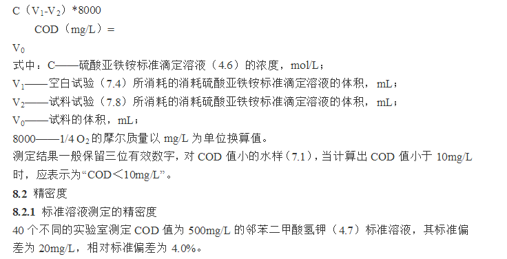7.6 校核試驗:按測定試料(7.8)提供的方法分析20.0m L鄰苯二甲酸氫鉀標準溶液(4.7)的COD值,用以檢驗操作技術及試劑純度。