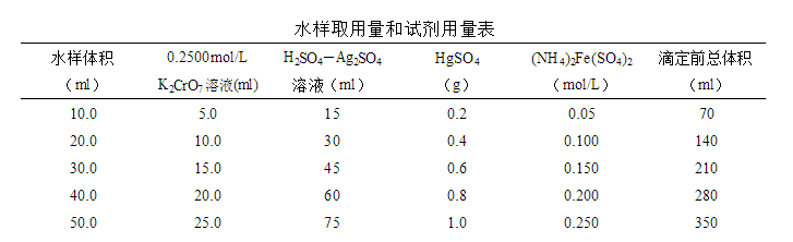 8.3 對于化學需氧量小于50mg/L的水樣,應改用0.0250mol/L重鉻酸鉀標準溶液。回滴時用0.01mol/L硫酸亞鐵銨標準溶液。