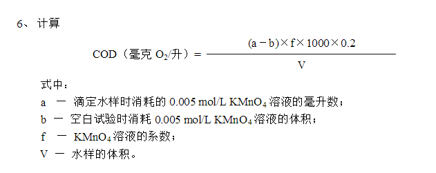 4.7 若水樣用蒸餾水稀釋時,需另取100ml蒸餾水,按步驟4.2~4.5測定空白值,記錄消耗的0.01 mol/L KMnO4溶液的毫升數V0。