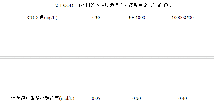 測(cè)定地表水、工業(yè)廢水(包括高鹽廢水)、生活污水的化學(xué)需氧量。根據(jù)水樣化學(xué)需氧量值得的不同,在消解時(shí)應(yīng)選擇不同濃度的重鉻酸鉀消解液進(jìn)行消解。參考表2-1選擇消解液。