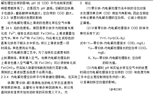 用新鮮的蒸餾水作內電解處理的平行樣(實驗時,空白樣與廢水樣的 pH、所用內電解材料、與水的比例和曝氣方式等工藝條件均相同),測定出廢水水樣 COD 與內電解處理的空白樣 COD 之差作為內電解對廢水的凈處理結果。 采用 CTL-2 型化學需氧量速測儀分別測定內電解前后水樣(取自圖 1 所示取樣點)的 COD。