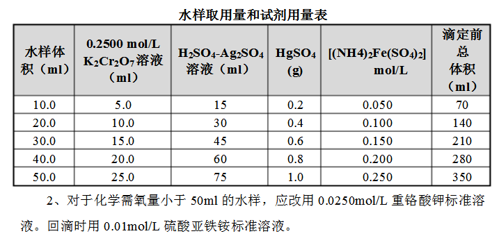 1、水樣取用體積可在10.00-50.00ml范圍內(nèi),但試劑用量及濃度需按下表進行相應(yīng)調(diào)整,也可得到滿意的結(jié)果
