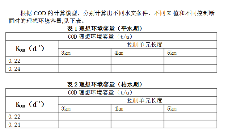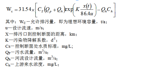 COD屬于可降解污染物用一維模型計算理想環(huán)境容量,對于點源排放,令混合后水質(zhì)濃度C等于水質(zhì)標(biāo)準(zhǔn)CS,由下式可計算河流的允許納污量: