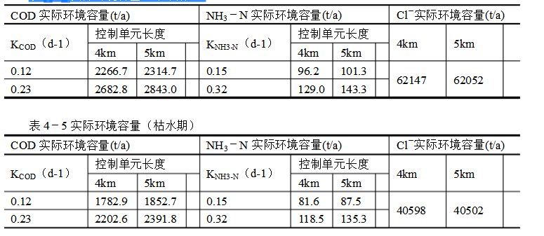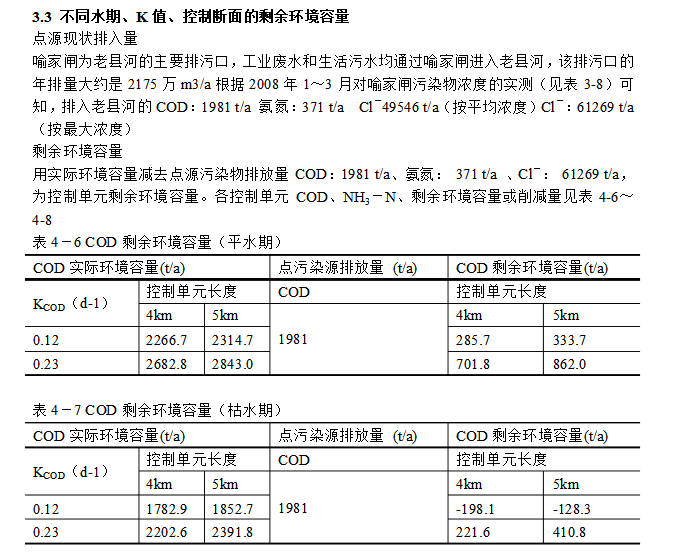 理想環(huán)境容量中扣除非點源污染物入河量后為實際環(huán)境容量,污染源調(diào)查中調(diào)查了老縣河匯水區(qū)面積、徑流量、徑流水質(zhì),并計算了面源污染物入河量(見表3-7),將整個匯水區(qū)內(nèi)(65km)面源污染物入河量按比例折算為控制單元內(nèi)面源污染物入河量,各控制單元理想環(huán)境容量扣除相應(yīng)面源入河量得到各控制單元實際環(huán)境容量。見表4-3.