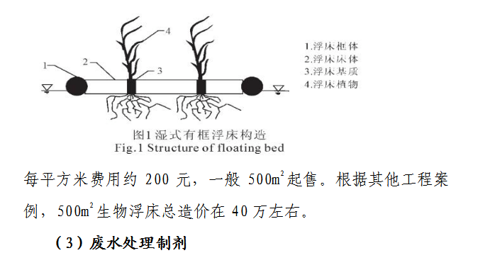 (2)生態浮床:人工生物浮床技術是按照自然界自然規律,人工把水生植物或改良的陸生植物,以浮床作為載體,種植到富營養化水體的水面,通過植物根部的吸收、吸附作用和物種競爭相克機理,消減富營養化水體中的氮、磷及有機物質,有的根據植物的吸附特性,可以去除水中重金屬物質,從而達到凈化水質的效果,同時又可營造水上景觀。 一般由四個部分組成:浮床框架、植物浮床、水下固定裝置以及水生植被。